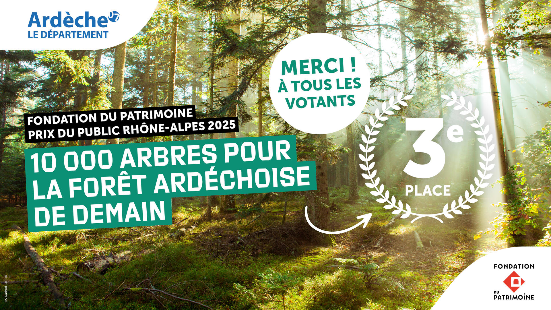 Dans le cadre du « Prix du public Rhône-Alpes 2025 de la Fondation du patrimoine », le projet ardéchois « 10 000 arbres pour la forêt ardéchoise de demain » a été sélectionné pour représenter l’Ardèche, aux côtés de 7 autres projets (chacun représentant un département). Celui ardéchois s’est distingué en tant que seul projet de patrimoine naturel.