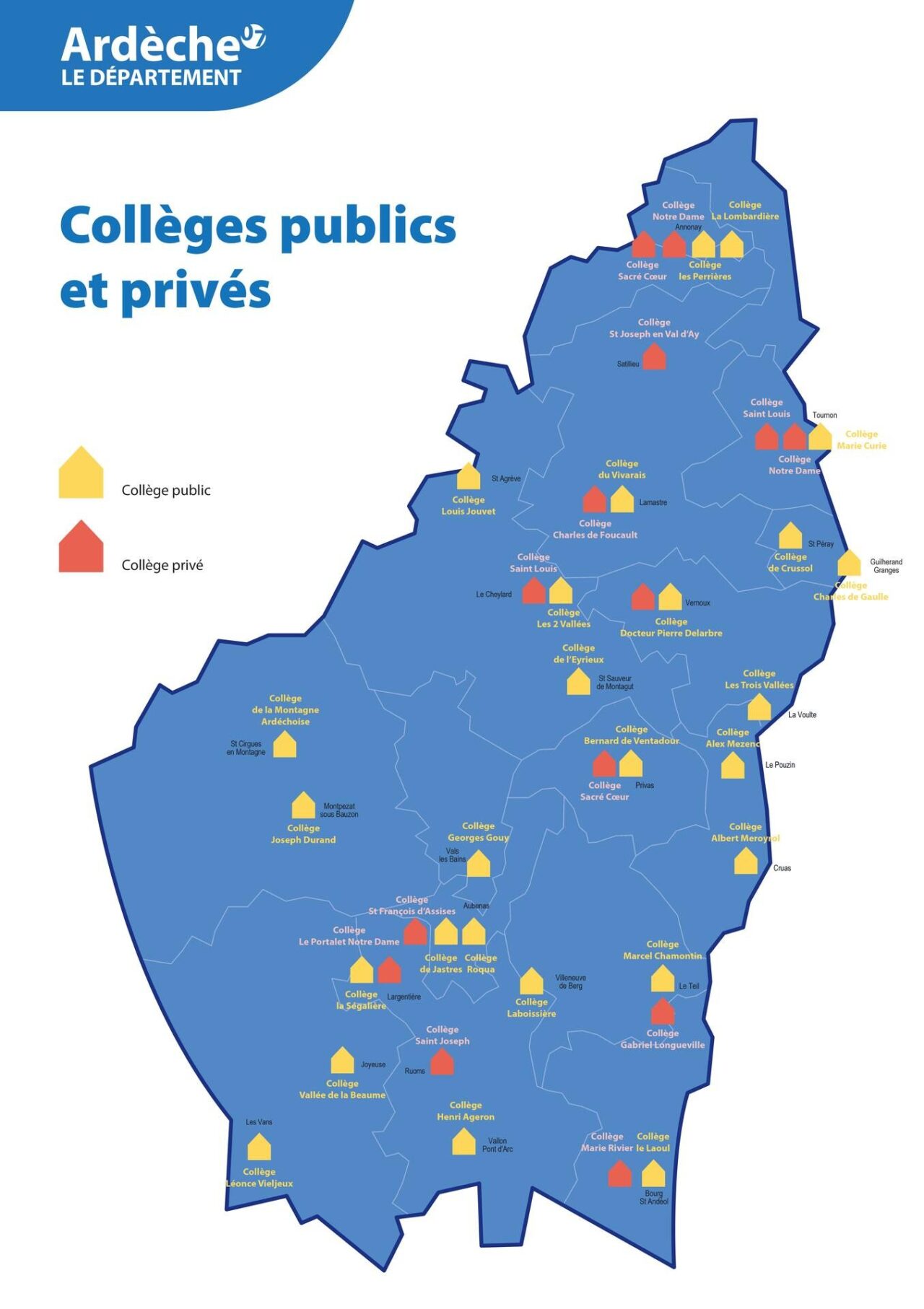 L’Ardèche présente 39 collèges pour environ 16 000 collégiens. La géographie du territoire, entre les Cévennes et la vallée du Rhône, a un impact important sur la répartition des établissements scolaires.